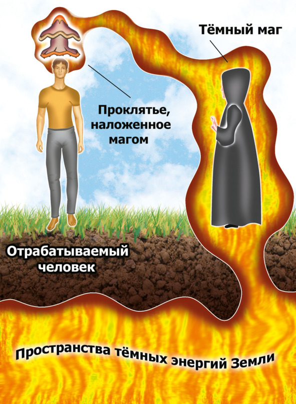 После этого с любой стороны от отрабатываемого человека представляем гипотетического мага в любом виде. Можете представить его, как обычного человека, это не принципиально. После этого создаете на отрабатываемом человеке форму энергии, охватывающую и человека и мага. Кроме того, не забудьте мысленно создать энергию проклятья, которая, вполне возможно, брошена магом на человека через привязку. Это наиболее частая ситуация и она вида из рисунка 17.