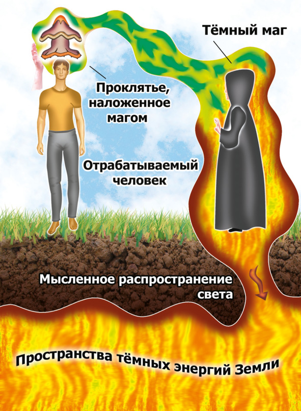Мы мысленно, подобно горению бенгальского огня, распространяем свечение далее по привязке, которым постепенно охватываем мага и устремляем его вниз в хранилища тёмных энергий Земли. Как только мы выплеснули свет в бескрайние объёмы тёмных энергий Земли логично изменить масштаб представляемого пространства таким образом, чтобы продолжать осветлять весь объём физической Земли. Так как эти пространства весьма объёмны, данную процедуру осветления желательно продолжить около пяти минут. После этого представляем, как тёмный маг разворачивается и уходит по придуманной вами красивой дороге. Это очень важно, потому что в момент вашей работы человек – маг может быть ещё жив. Учитывая материальность мысли, не стоит никому нести мысленного Зла. Пусть идёт и разбирается со своей судьбой сам. Данная работа изображена на визуализации рисунка 18. После того, как маг ушёл, необходимо снять с человека оставшееся проклятье. Для этого мы произносим: