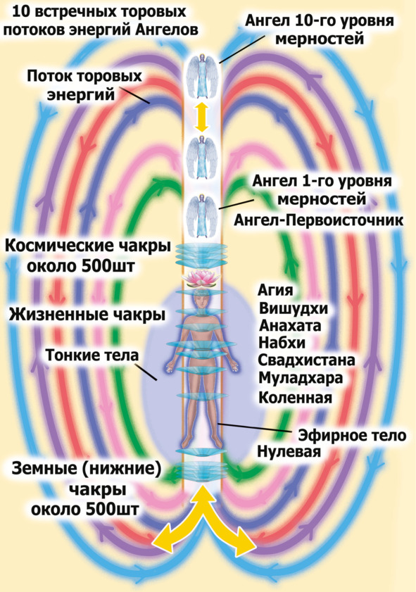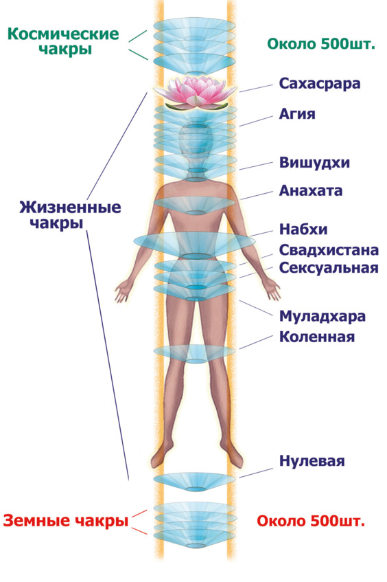 Данная информация значительно отличается от существующих общепринятых понятий о чакрах, однако она проверена на практике. У человека имеется ориентировочно около тысячи чакр, расположенных над человеком, на физическом уровне тела и под человеком. Назовем чакры, расположенные выше Сахасрары, космическими чакрами. Чакры, расположенные рядом с физическим телом, можно назвать жизненными; чакры же, расположенные под человеком, назовём земными или нижними. Они названы так по признаку решаемых ими задач. Каждая чакра всегда работает в двух режимах. Первый режим связан с захватом и фильтрацией энергий Божественного Потока, и доставкой его внутрь энергетической структуры. Второй режим – это режим излучения энергий в пространство.
