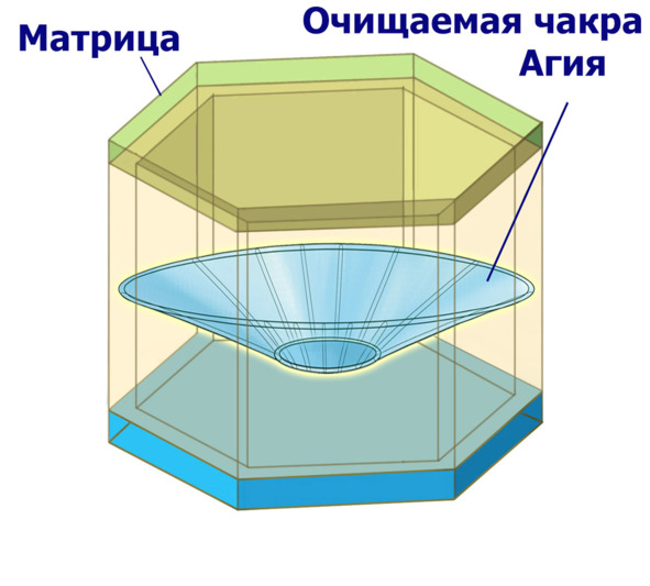 Например, если вы хотите почистить чакру Агию, вы мысленно создаёте перед собой шестигранник комфортной для вашей мысленной работы высоты и называете его: «Матрица очищения чакры Агии». Далее, мысленно сказав: «Я помещаю чакру Агию в Матрицу», вы получаете тот механизм, который готов провести очищение этой чакры.