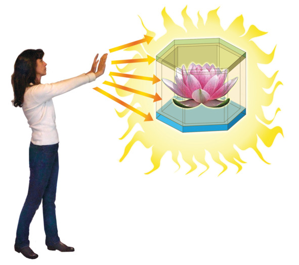 – Поднимаем руки-крылья вверх и делаем полуоборот налево таким образом, чтобы они пронизали лотос с левой стороны до середины, то есть плоскость крыльев, соответствующая плоскости ладоней, попала в левую полость цветка и перекрыла весь его объём от середины.