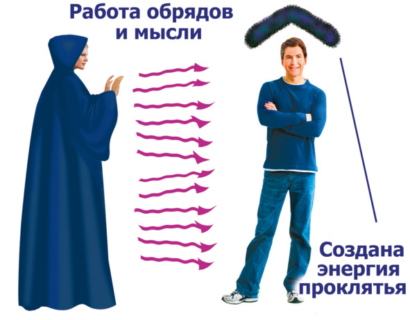 Первый способ является прерогативой всевозможных магов и шаманов разного тёмного толка. Основой для создания таких энергий являются энергетические запасы Земли, имеющие, в том числе, очень низкие вибрации, создаваемые человечеством всех поколений, существовавших на Земле. Можно сказать, что их основа берёт свое начало в эгрегорах тёмных энергий социума. Это энергии, накопленные человечеством за весь период своего существования. Накопление в определенных локальных пространствах Земли тёмных энергий, создаваемых людьми, является планомерным процессом потому, что эта ситуация создана самими законами Земного эксперимента. Духовная сторона человечества из первобытных вибраций постепенно поднимается вверх, но, сколько на этом пути совершенствования совершено ошибок в поиске истины, приводящих к созданию негативных энергий, пластующихся постепенно в тяжелые, тёмные вибрации, и обретающих своё сознание. Постепенно во времени складывалась ситуация, которая привела к тому, что в данных эгрегорах, как управляющие звенья, появились тёмные духи. Так как всевозможные магические познания росли вместе с интеллектом человека, то со временем появились люди, которые имели возможность общения с определёнными духами. Эти возможности, вероятно, обнаруживались у людей, которые в некоторых жизненных ситуациях выходили из обычного разумного состояния, теряя защиту. Именно в этот момент к их энергетике подключались те тёмные Духи, о которых мы говорили ранее. Духи тоже разумны, и далеко не всегда им нужны страдания людей в качестве меры их деятельности. Они понимают, что распространение своего влияния и силы возможно и тогда, когда человек получит часть возможностей тёмной силы и начнёт в своих эгоистических интересах использовать её для достижения своих целей. Выйдя из очередного состояния «вне разума», человек уже мог с ними разговаривать. Более того, те силы, которые предлагали человеку Духи, тоже умеют лечить людей, но за это требуется расплата. Возможно, такой человек, работая с другими людьми, подключал их к тем же тёмным каналам, которыми пользовался сам. Это значит, что временно человек выздоравливал, и это способствовало успеху данного мага. К нему образовывался поток людей, желающих получить исцеление, но спустя некоторое время, они заболевали, оплачивая своё исцеление тёмной силой. Первое, то есть выздоровление, явно; второе, или повторение серьёзных болезней спустя время – неявно. Часто тёмные маги или шаманы используют заговоры. Вероятно, когда тёмные Духи подключены к человеку, они находят способ сообщать ему суть заговоров или последовательность магических действий для того, чтобы вызвать их для выполнения своих тёмных задач. Каждый обряд представляет собой программу для энергии, которая должна быть отправлена на того человека, с кем работает тёмный маг. Скорее всего, в разных видах тёмной магии обряд проклятья имеет различные формы, но это вполне возможно, потому что в своё время, когда появлялись основатели определенных магических кланов, они общались с разными тёмными Духами одного и того же эгрегора. Таким образом, энергия проклятья создаётся магами сознательно, с применением определённых обрядов в адрес того человека, на которого направлена их работа. В результате этой работы энергия проклятья располагается над