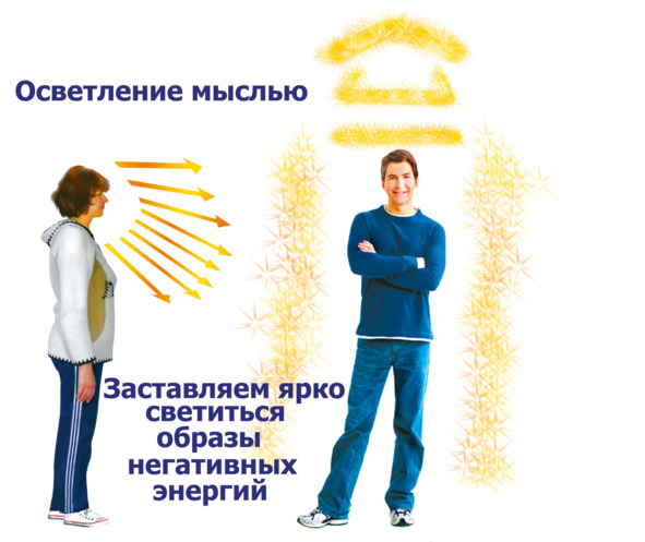 Существует и другой способ удаления таких негативных энергий. Он основан на трансформационной способности человека изменять качество энергий мыслью. Этот метод следует применять достаточно редко, только при крайней необходимости, и использовать его только тогда, когда в целях исцеления, эти энергии необходимо снимать с человека, для которого применение способа, связанного с намерением, по ряду причин невозможно.