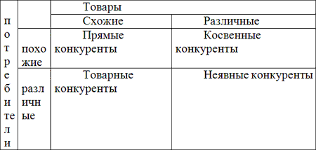 По производимому товару и ориентации на потребителя конкурирующие с вами организации можно разделить на четыре типа. Делать это удобно с помощью таблицы 1.5.
