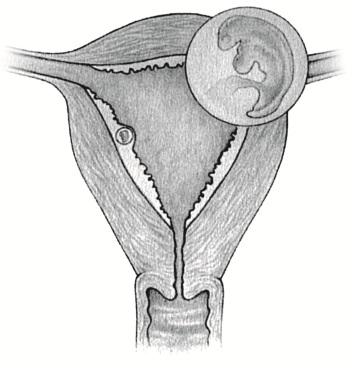 Когда зародыш внедряется в пронизанную кровеносными сосудами слизистую оболочку, возможно выделение нескольких капель крови. Этот увеличивающийся росток новой жизни, который получил название «бластоцит», начинает организовываться в группы клеток, в каждой из которых насчитывается несколько сотен. Некоторые из этих клеток укрепляются в рыхлой слизистой оболочке матки, другие собираются в группы, каждую из которых ждет своя судьба. Матка, реагируя на присутствие эмбриона, начинает формировать зачаток плаценты, которая передает питательные вещества из крови матери развивающемуся ребенку и удаляет продукты жизнедеятельности плода. По мере своего развития плацента начинает вырабатывать гормон ЧХГ (человеческий хорионический гонадотропин), который укрепляет слизистую оболочку матки и стимулирует рост эмбриона, поддерживая высокие уровни эстрогена и прогестерона. С развитием плаценты ЧХГ попадает в кровь матери. К концу второй недели при проведении теста на беременность в моче матери тоже обнаруживается этот гормон.