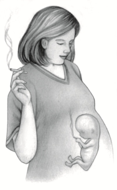 Курение лишает ребенка питательных веществ. Многие исследования показали, что у курящих матерей дети рождаются с меньшим весом, чем у тех, кто не курит. Никотин из дыма, вдыхаемого матерью, попадает в кровь. Ядовитое вещество сужает кровеносные сосуды матки, уменьшая приток крови к находящемуся в ней ребенку. Здоровое развитие ребенка зависит от притока крови – его уменьшение означает недостаточное питание, а значит, и замедление роста. Как правило, крупные младенцы оказываются здоровее и реже нуждаются в особом уходе после рождения.
