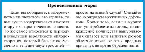 Если вы собираетесь забеременеть или пытаетесь это сделать, то вам лучше воздержаться от алкоголя и других наркотических веществ. То же самое относится к периоду наибольшей вероятности оплодотворения, который бывает ежемесячно в течение двух-трех дней – просто на всякий случай. Считайте это «контролем врожденных дефектов». Кроме того, если вы курите или употребляете алкоголь, то сокращение количества выкуриваемых сигарет или выпитых рюмок облегчит отказ от этих вредных привычек во время беременности.