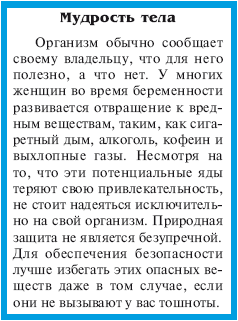 Организм обычно сообщает своему владельцу, что для него полезно, а что нет. У многих женщин во время беременности развивается отвращение к вредным веществам, таким, как сигаретный дым, алкоголь, кофеин и выхлопные газы. Несмотря на то, что эти потенциальные яды теряют свою привлекательность, не стоит надеяться исключительно на свой организм. Природная защита не является безупречной. Для обеспечения безопасности лучше избегать этих опасных веществ даже в том случае, если они не вызывают у вас тошноты.