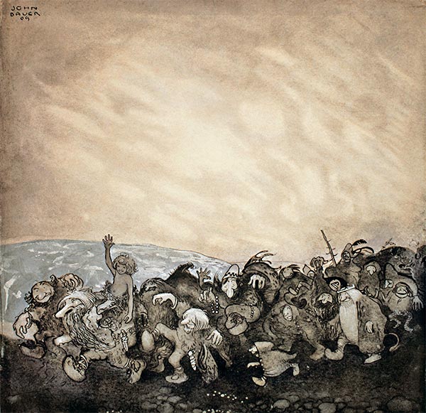 В маленькой крестьянской избушке воцарились грусть и уныние. Дети плакали, а отец с матерью не могли ни слова сказать от горя. О продолжении поисков не могло быть и речи: никогда ещё ни один человек не осмеливался войти в ужасные пещеры, где обитали тролли.