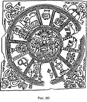 В начале двадцатого столетия в Галилее, на севере Израиля, археологи обнаружили руины синагог, которые были построены через десятки и сотни лет после разрушения римлянами Второго Храма (в 70 году нашей эры). К их величайшему удивлению, у всех этих синагог обнаружилась одна общая черта: их полы были украшены искусной мозаикой, в узорах которой присутствовали знаки Зодиака. Как видно из рисунка одной из них, из местечка Бет-Альфа (рис. 89), количество знаков – двенадцать – было таким же, как в наши дни, а сами знаки и их названия в точности совпадали с современными. Названия были написаны шрифтом, ничем не отличающимся от современного иврита, и начинались (на востоке) с Талеха (Овен), за которым шел знак Шор (Телец), затем Дагим (Рыбы) – и так далее, в том же самом порядке, что и тысячу лет спустя.