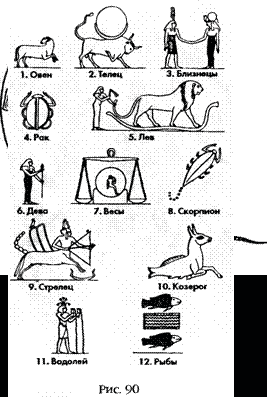 Несмотря на все имеющиеся факты, до недавнего времени в научных кругах господствовало мнение, что сама концепция Зодиака, а также все его названия и символы были придуманы греками, поскольку само слово «зодиак» имеет греческое происхождение и означает «круг животных». Допускалось, правда, и возможное египетское влияние, поскольку в Египте были известны знаки Зодиака с теми же названиями и символами (рис. 90). Несмотря на древность некоторых египетских рисунков – включая великолепные рисунки храма в Дендере, на которых мы подробно остановимся ниже, – концепция Зодиака родилась не в Египте. Работы многих ученых, например Э. С. Круппа («In Search of Ancient Astronomies»), подтверждают, что «все имеющие свидетельства указывают на то, что идея Зодиака возникла не в Египте, а была импортирована туда из Месопотамии». Древнегреческие ученые, знакомые с обычаями и искусством Египта, в своих трудах тоже отмечали, что знания по астрономии – по крайней мере – принесли египтянам халдеи, астрономы-священники из Вавилона.