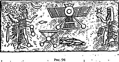 Изобретенное ануннаками как связь между божественным временем (циклом, в основе которого лежал орбитальный год Нибир, равный 3600 земных лет) и земным временем (периодом вращения Земли вокруг Солнца), небесное время (период в 2160 лет, определяющий прецессионный переход от одного дома Зодиака к другому) служило для датировки главных событий в доисторические времена. Точно так же в наше время поступает археоастрономия. Так, например, изображение ануннаков в виде астронавтов, а также космического корабля, курсирующего между Марсом (шестиконечная звезда) и Землей (обозначенной семью точками и лунным серпом), отнесено к Эре Рыб, поскольку на рисунке присутствует знак Зодиака в виде двух рыб (рис. 94). Шумерские тексты тоже используют небесное время: примером тому может служить текст, в котором Великий потоп помещен в Эру Льва.