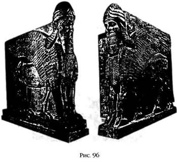 Одними из наиболее впечатляющих находок, в настоящее время украшающими ассирийские и вавилонские отделы во всех крупнейших музеях мира, можно считать колоссальные каменные изваяния животных с туловищем быка или льва и головами богов в рогатых головных уборах (рис. 96), которые охраняли входы в храмы. Можно смело предположить, что эти «мифические существа», как называют их ученые, представляют собой воплощенный в камне мотив борьбы Тельца и Льва, о котором мы упоминали выше, и связывают храмы с магией древнего небесного времени и богами, ассоциировавшимися с прошедшими зодиакальными эрами. Археологи убеждены, что эти скульптуры были выполнены по образцу египетских сфинксов, главным образом Великого Сфинкса в Гизе, о котором ассирийцы и вавилоняне прекрасно знали – этому способствовали торговые связи и войны. Однако записи Гудеа показывают, что за полтора тысячелетия до того, как эти зодиакальные и одновременно божественные существа заняли место в ассирийских храмах, Гудеа уже поставил сфинксов в храме Энинну: мы читаем о «льве, внушающем ужас», и о «диком быке, припавшем к земле, словно лев». К удивлению археологов, полагавших, что сфинксы были неизвестны в Древнем Шумере, среди руин Гирсу в Лагаше была обнаружена статуя Нинурты/Нингирсу в виде припавшего к земле сфинкса (рис. 97).