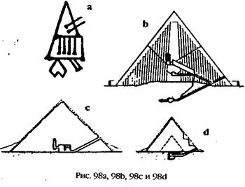 В поисках такого сооружения нам поможет пиктограмма Хуги. Здесь нас ждет просто потрясающее открытие – этот значок представляет собой схематичное изображение египетской пирамиды (рис. 98а) со всеми ее опорами, внутренними проходами и подземными помещениями. Более того, это похоже на схему великой пирамиды в Гизе (рис. 98б) и ее уменьшенной модели, малой пирамиды в Гизе (рис. 98с), а также первой пирамиды фараонов (рис. 98d), которая получила название Красной пирамиды – то есть имела тот же цвет, на который указывает слово Хуш.