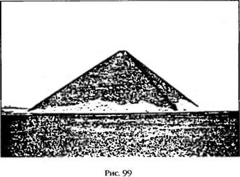 Когда в Лагаше строился храм Энинну, Красная пирамида уже существовала. Это была одна из трех пирамид, приписываемых Снеферу, первому фараону IV династии, который правил примерно в 2600 году до нашей эры. Его архитекторы впервые предприняли попытку построить для него пирамиду, сымитировав 52-градусный наклон пирамид в Гизе, возведенных ануннаками на тысячу лет раньше, однако наклон оказался слишком крутым, и сооружение рухнуло. Это обрушение привело к поспешной корректировке угла наклона граней второй пирамиды в Дашуре (до 43 градусов), в результате чего это сооружение получило название «плоской» пирамиды. Затем в Дашуре была построена третья пирамида фараона Снеферу. Она считается первой классической пирамидой фараонов, и ее грани имеют безопасный наклон примерно 43,5 градуса (рис. 99). Она была возведена из местного розового известняка и получила название Красной пирамиды. Выступы на ее гранях предназначались для крепления облицовки из белого песчаника, но эта облицовка продержалась недолго, и сегодня пирамида предстает перед нами в первозданном красноватом виде.