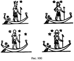 Важной и уникальной особенностью «гражданского» календаря было деление тридцатидневных месяцев на «деканы», то есть периоды по десять дней, каждый из которых начинался гелиакальным восходом определенной звезды. Данная звезда (изображенная в виде бога, плывущего в лодке по небу, рис. 100) должна была указывать на последний час ночи, а по истечении десяти дней наблюдения переносились на другую звезду.