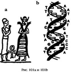 Быть может, в отношениях братьев присутствовала ревность? Оба получили знания по математике и астрономии, оба были обучены искусству строительства святилищ; свидетельством достижений Мардука в этих областях служит величественный зиккурат в Вавилоне (см. рис. 33), который – по утверждению «Энума элиш» – был спроектирован им самим. Однако, как свидетельствует приведенный выше текст с жалобами, в области медицины Мардук уступал брату: он не умел воскрешать мертвых, а Тот умел. Об этом говорят как месопотамские, так и египетские источники. На шумерских рисунках он изображается с эмблемой из переплетенных змей (рис. 101а). Эта эмблема принадлежала его отцу Энки, который владел искусством генной инженерии – вполне возможно, что это было изображение двойной спирали ДНК (рис. 101б). Шумерское имя Тота, НИН.ГИШ.ЗИДДА, означает «Владыка чистого дерева» и свидетельствует о его умении воскрешать мертвых. В одном из шумерских гимнов он назван «Господином исцеления», «Господином, который держит за руку», «Владыкой чистого дерева». Его имя постоянно встречается в магических заклинаниях, посвященных врачеванию, и в эзотерических текстах. В серии заклинаний и магических формул Маклу «О сжиганиях» ему посвящена целая табличка под номером семь. В одном из заклинаний, посвященных утонувшим мореплавателям, жрец взывает к формулам «Сирис и Нингишзиды, волшебников и магов».