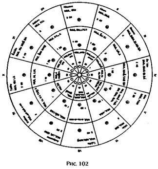 В 1900 году востоковед Т. Дж. Пинчес, выступая на заседании Королевского астрономического общества, представил свою реконструкцию месопотамской астролябии. Это был круглый диск, разделенный, подобно разрезанному пирогу, на двенадцать секторов и три кольца, в результате чего все небо оказывалось поделенным на тридцать шесть областей (рис. 102). Круглые I символы рядом с названиями указывали на небесные I тела, а сами названия (транслитерированные) были названиями зодиакальных созвездий, звезд и планет – всего тридцать шесть. Тот факт, что это деление связано с календарем, подтверждали названия месяцев, написанные в верхней части каждого сегмента (маркировка I от I до XII, начиная от вавилонского месяца нисанну, сделана Пинчесом).