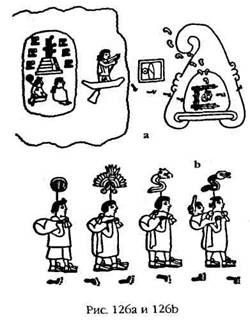 Одним из наиболее полных циклов является цикл мифов племен нахуатль из центральной Мексики, последними из которых были истребленные испанцами ацтеки. Их легенды о переселениях охватывают четыре эпохи, или «Солнца», причем первая из них закончилась Великим потопом. Одна из версий, в которой указывается длительность этих эпох, сообщает нам, что первое «Солнце» началось за 17 141 год до того, как эта легенда была рассказана испанцам, то есть примерно в 15 600 году до нашей эры, за тысячи лет до Великого потопа. Легенды и мифы, записанные в виде пиктограмм в книгах, которые называются кодексами, повествуют о том, что первые люди пришли из Ацлана, «Белого Места», которое ассоциировалось с цифрой семь. Иногда оно описывалось в виде семи пещер, из которых вышли предки, а иногда изображалось как место семи храмов: большой ступенчатой пирамиды (зиккурата) в окружении шести храмов меньшего размера. Кодекс Ботурини содержит серию напоминающих комиксы рисунков, которые рассказывают о переселении четырех племен в незапамятные времена. Люди вышли из места семи храмов, пересекли море на лодках и высадились на берег в стране пещер; на пути в неведомое мигрантов вел за собой бог, символ которого напоминал Всевидящий Глаз, прикрепленный к эллиптическому жезлу (рис. 126а). Затем четыре клана направились в глубь материка (рис. 126b), пройдя через различные земли. Они разбились на несколько племен, и одно племя, Мексика, в конце концов добралось до долины, где они увидели орла, сидящего на кактусе. Это был знак, что они дошли до места назначения, и именно здесь была построена столица народа нахуатлан. Затем город стал столицей ацтеков, которые сохранили древнюю эмблему, сидящего на кактусе орла. Город назвали Теночтитплан, город Теноча. Эти первые поселенцы назывались теноча, или народ Теноча. В одной из предыдущих книг я приводил доводы в пользу гипотезы, что они могли быть потомками Еноха, сына Каина, которые все еще страдали от проклятия, наложенного на их предка за братоубийство. Согласно Библии, Каин, удалившийся в «землю Нод», построил город и назвал его именем своего сына, Енох; у Еноха было четыре потомка, от которых произошли четыре клана.