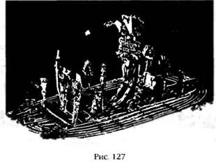 В музее золота в Боготе хранится реликвия из чистого золота (рис. 127), представляющая собой миниатюрную копию бальзового плота, на котором расположился высокий капитан со своими спутниками. Вполне возможно, что в этом произведении искусства запечатлено морское путешествие Наймлапа или кого-то из его соплеменников. Согласно легенде, эти люди были хорошо знакомы с календарем и поклонялись двенадцати богам. После высадки на берег они двинулись в глубь материка, обосновались в том месте, где теперь находится столица Эквадора Киото, и построили два храма друг напротив друга: один был посвящен Солнцу, а другой Луне. У входа в храм Солнца стояли две каменные колонны, а во дворе перед ним – круг из двенадцати каменных столбов.