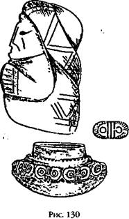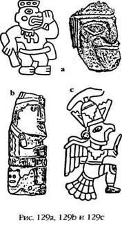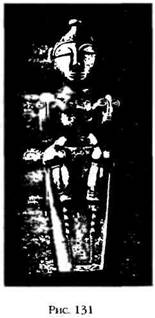 Фриц Бак («Inscriptiones Calendarias del Peru Priencaico»), который сделал эту область исследований своей специальностью, полагал, что 116 отверстий, или углублений, в шестнадцати квадратах указывают на связь с календарем майя из Мексики и Гватемалы. В настоящее время факт существования тесных контактов народов и культур из северных районов Анд и Центральной Америки – совсем недавно его начисто отрицали – уже не подлежит сомнению. Среди переселенцев из Центральной Америки, вне всякого сомнения, были африканские и семитские племена, что подтверждается многочисленными образцами каменной резьбы и статуэток (рис. 129а). До них на континент прибыли морем народы, которые можно отнести к индоевропейцам (рис. 129Ь), а в промежутке между этими волнами миграции на эти берега высадились «люди-птицы» (рис. 129с) со шлемами на головах и оружием из металла. Еще одна группа могла прийти по суше через бассейн Амазонки и ее-притоков; их символы практически идентичны с хеттскими иероглифами для обозначения «богов» (рис. 130). Хеттский пантеон был лишь разновидностью шумерского пантеона, и этот факт, возможно, объясняет удивительную золотую статуэтку, найденную в Колумбии. Это изображение богини, которая держит в руках нож для перерезания пуповины – эмблему Нинхурсаг, Богини Матери шумеров (рис. 131).