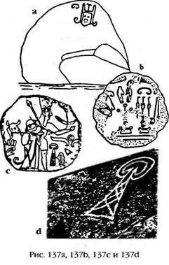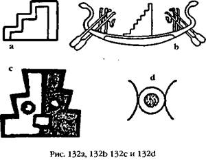 Чаще всего встречался символ, или – как называл их Познански – иероглиф, с изображением лестницы (рис. 132а), который также использовали в своих рисунках египтяне (рис. 132 Ь) и который часто появлялся на андских артефактах в виде «наблюдательной» башни (рис. 132с). Такие наблюдения, если судить по планировке Калассайи и по символам небесных тел в Тиахуанаку, включали в себя и Луну (чьим символом был круг между двумя полумесяцами, рис. 132d).