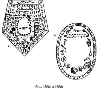 Самыми необычными артефактами – из-за которых некоторые первые исследователи назвали эту скалу «Местом каменных книг» – были дольмены, большие плоские камни, лежавшие на опорах и весившие от пятнадцати до двадцати тонн каждый. Их поверхность была искусно раскрашена, а два камня имели правильную форму – пятиугольника (рис. 133а) и овала (рис. 133б). На обоих камнях, как и у входа в пещеру, доминирующим изображением была змея. Это обстоятельство, а также другие символы натолкнули Хомета на мысль о Древнем Египте и восточном Средиземноморье. Поскольку многие дольмены были установлены на уровне входов во внутренние гроты и рядом с ними, ученый пришел к выводу – об этом также рассказывали легенды индейцев, – что это было священное место захоронения вождей или других знатных людей «цивилизованного народа, который жил в этих местах, так же как и в Тиахуанаку, огромном городе в Андах, в глубокой древности – возможно, за тысячи лет до рождения Христа».