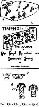 Только в Британской Гвиане было обнаружено больше десятка мест, где скалы покрыты резьбой. Неподалеку от Каракананка в горах Пакараимо петроглифы (рис. 134а) представляют собой изображение звезд с разным количеством лучей (шумерское изобретение), полумесяц, солнце, а также нечто, напоминающее прибор для наблюдений, расположенный рядом со ступеньками.