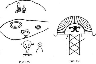 В соседнем Суринаме (бывшая голландская Гвиана), в районе водопадов Фридриха-Вильгельма IV, петроглифы настолько многочисленны, что ученым пришлось пронумеровать места их расположения, каждую группу в пределах одного места, а также каждый петроглиф в группе. Некоторые из них (рис. 135) сегодня можно принять за изображения НЛО и их экипажей – точно так же как петроглиф (рис. 136) из зоны 13 у водопада Уонотобо, где уже знакомое изображение высокого существа с нимбом трансформируется в сооружение с куполом и спускающейся вниз лестницей, в отверстии которого стоит могучий человек