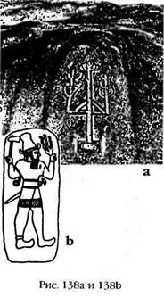 Эти петроглифы были обнаружены как в обеих прибрежных зонах, так и вдоль основных маршрутов пересечения континента. Чем ближе они к третьей фазе, тем отчетливее становится небесная символика. И чем ближе они к южным районам материка, будь то Бразилия, Боливия или Перу, тем сильнее они напоминают Шумер, Месопотамию и Анатолию. Некоторые ученые, и особенно в Южной Америке, интерпретируют разнообразные значки как разновидность шумерской письменности. Самый большой петроглиф в этом регионе – это так называемый канделябр, или трезубец, встречающий каждого, кто причаливает к тихоокеанским берегам Южной Америки в заливе Паракас (рис. 138а). Согласно местным легендам это испускающий молнии жезл Виракочи, аналогичный тому, что изображен в верхней части Ворот Солнца в Тиахуанаку. Мы склонны отождествлять его с символом «бога бурь» (рис. 138б), младшего сына Энлиля, которого шумеры называли Ишкур, вавилоняне и ассирийцы Адад, а хетты Тешуб («создающий ветер»).
