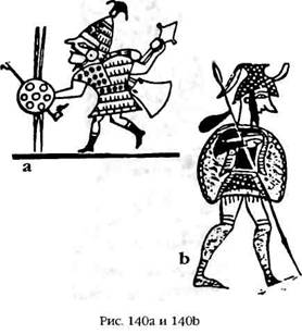 Нужно быть специалистом по древней керамике, чтобы увидеть разницу между некоторыми образцами керамики из Анатолии и Анд, особенно отполированной красно-рыжей керамики бронзового века. Однако даже неспециалист заметит сходство между странными воинами, изображенными на артефактах из прибрежных районов Перу (рис. 140а), и доэллинскими воинами на артефактах из восточного Средиземноморья (рис 140б).