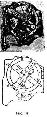 Предметы и материалы, поднятые со дна моря, были доставлены в Афины для более тщательного изучения. Среди них оказались бронзовая лампа и осколки какого-то предмета, вызвавшие неподдельное изумление ученых. Осколки очистили и склеили. Этот «предмет» (рис. 141) оказался точным механизмом с множеством шестеренок, сцепленных между собой в различных плоскостях и помещавшихся внутри круглой рамы, которая, в свою очередь, находилась в квадратном футляре. Все это напоминало астролябию со «сферической проекцией и набором колец». После длившихся несколько десятилетий исследований с применением рентгеновских лучей и металлургического анализа этот прибор был выставлен в Национальном археологическом музее Афин (каталожный номер X. 15087). На витрине имеется табличка с пояснительной надписью: