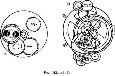 Тем не менее, факт остается фактом: нигде не было найдено ни одного устройства, которое по сложности и точности могло сравниться с этим прибором и быть изготовлено на протяжении нескольких столетий до или после кораблекрушения у острова Антикифера. Даже средневековые астролябии, которые моложе прибора из Антикиферы на тысячу лет, по сравнению с древним механизмом выглядят детскими игрушками (рис. 142а). Более того, средневековые и более поздние европейские астролябии и другие подобные устройства изготовлены из латуни, которая обладает хорошей ковкостью, тогда как древний прибор (рис. 142б) сделан из бронзы – металла, который хорошо поддается литью, но которому трудно придать нужную форму и особенно изготовить из него механизм, превосходящий по сложности современные хронометры.