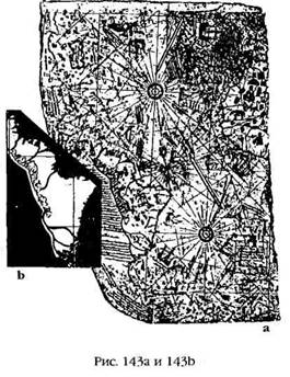 На другом берегу Эгейского моря, в Стамбуле (Константинополе – бывшей столице Византии и затем Оттоманской империи), в музее Топкапи, разместившемся в помещениях бывшего дворца, хранится еще одна находка, проливающая свет на возможности древней навигационной науки. Данный документ известен как карта Пири Рейса – по имени составившего ее адмирала и относится к 1513 году нашей эры (рис. 143а). Это одна из немногих дошедших до нас карт мира времен эпохи великих открытий, и особый интерес она вызывает несколькими своими особенностями. Во-первых, это удивительная точность, а также сложный метод проецирования поверхности земного шара на плоскость. Во-вторых, это изображение всего южноамериканского континента (рис. 143b) вместе с узнаваемыми топографическими и географическими чертами как атлантического, так и тихоокеанского побережий. И третья особенность – верное изображение Антарктиды. Карта была составлена через несколько лет после путешествия Колумба, однако в 1513 году южная часть южноамериканского континента еще не была известна жителям Старого Света – Писарро совершил морской переход из Панамы в Перу только в 1530 году, а испанцы исследовали побережье и углубились внутрь континента к горной цепи Анд лишь несколько лет спустя. Тем не менее на карте изображена вся Южная Америка, включая Патагонию. Антарктида – не только очертания, но и само существование этого материка – была неизвестна европейцам до 1820 года, то есть еще три столетия после составления карты Пири Рейса. Тщательнейшие исследования, проведенные после обнаружения документа в сокровищнице султана в 1929 году, подтвердили эти загадочные особенности карты.