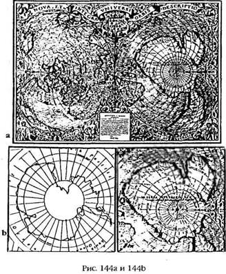 Ученые единодушны в том, что наиболее вероятным источником этих сведений была карта мира, составленная в 1531 году Оронтеусом Финиусом (рис. 144а). На карте, где была точно спроецирована поверхность земного шара, разделенная на две полусферы с эпицентрами в точках северного и южного полюса, присутствовало не просто изображение Антарктиды – факт, удивительный сам по себе. Более того, карта показывала географические и топографические особенности континента, на протяжении многих тысячелетий скрытые под толстым ледяным панцирем.