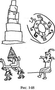 Еще севернее, среди гробниц в Хольмуле в Гватемале (рис. 148), обнаруживается египетский символ совершенства, представляющий собой изображение пирамиды. Здесь же встречается рисунок круглой ступенчатой башни, а рядом ее план. По всей вероятности, это круглая обсерватория, похожая на те, что существовали на юге, на мысе Саксахуаман.