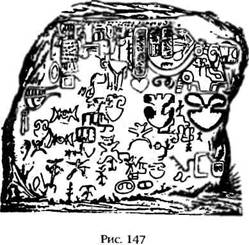 Севернее Кайамарки, в Колумбии, которая располагается ближе к Центральной Америке, на берегу реки Магдалена среди многочисленных петроглифов встречаются явно хеттские и египетские (рис. 147), такие, как «бог» и «царь», а также разнообразные египетские символы: картуши (длинные округлые обрамления имен царей), иероглиф, обозначающий «величие» (круг с точкой в центре, похожий на Солнце с золотистой короной из лучей), «двойная луна», топор Мина.