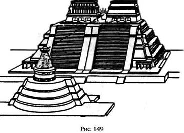 В самом центре владений Кетцалькоатля, в Мексике, где петроглифы трансформировались в иероглифы, напоминающие первые иероглифы Египта, наиболее заметными свидетельствами его присутствия служат храмы, ориентированные по сторонам света, в том числе круглые и полукруглые, а также круглые обсерватории. Эти руины начинаются с двух холмов идеально круглой формы, которые образуют линию астрономических наблюдений в Ла-Вента, одном из первых городов ольме-ков – африканских сторонников Тота, которые пересекли Атлантический океан и высадились на берегах Америки примерно в 2500 году до нашей эры. Другим выдающимся памятником четырех тысячелетий, прошедших с этого момента до прихода испанцев, и последним представителем круглых обсерваторий является полукруглая пирамида в святилище ацтеков в Теночтитлане (на территории современного Мехико). Она была ориентирована таким образом, чтобы день равноденствия определялся по тому моменту, когда солнце (если смотреть с верхушки круглой «Башни Кетцалькоатля») будет всходить точно по центру Пирамиды Двух Храмов (рис.149).