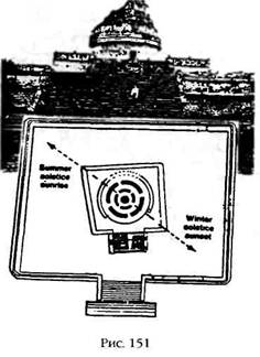 Хронологически между строениями ольмеков и ацтеков располагаются бесчисленные пирамиды и священные обсерватории майя. Некоторые из них, как, например, в Куикуилко (рис. 150а), имели форму правильного круга. Другие, как пирамида в Семпоале (рис. 150b), по утверждению археологов, первоначально представляли собой круглые постройки, но затем их форма изменилась – по мере того как ведущие наверх узкие ступеньки превращались в монументальную лестницу с площадью перед ней. Самая известная из них – Караколь в Чичен-Ице на полуострове Юкатан. Это круглая обсерватория (рис. 151), астрономическая ориентация и функция которой тщательно изучены и не вызывают сомнений. Несмотря на то что сооружение, которое мы видим сегодня, датируется примерно 800-м годом нашей эры, известно, что майя отвоевали Чичен-Ицу у прежних ее обитателей и построили свои здания на месте старых. Ученые предполагают, что на этом месте стояла гораздо более древняя обсерватория, которую майя, следуя своим традициям, попросту перестроили – как и многие пирамиды.