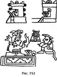 Для астрономических наблюдений жрецы майя использовали приборы, изображения которых часто встречаются в их кодексах (рис. 152). Случаи сходства с ближневосточными инструментами, площадками для наблюдения и символами слишком многочисленны, чтобы это сходство можно было считать совпадением. Практически все площадки для наблюдения идентичны тем, что устраивались на месопотамских сторожевых башнях; значок «лестница», который сформировался на основе изображения этих башен, повсеместно встречается в обсерватории Тиахуанаку, а также хорошо различим в кодексах майя. В одном из них, Кодексе Бодли (нижняя часть рис. 152), изображено, как два астронома-жреца наблюдают за восходом солнца, диск которого появляется между двух гор. Именно так в египетских иероглифических текстах объяснялось значение слова «горизонт», и, возможно, вовсе не случайно две горы в кодексе майя напоминают две пирамиды в Гизе.