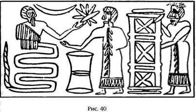 По мере того как ситуация ухудшалась, а день катастрофы приближался, Астрахасис продолжал выполнять роль посредника между людьми и богом Энки. «Он приходил к храму бога», «Приношенья к ногам его ставил. Каждый день он горестно плакал, Вместе с зарей приносил ему жертвы». Ища помощи у Энки, чтобы помешать уничтожению человечества, он «призывал имя своего бога» – именно эти слова используются в приведенном выше отрывке из Библии. В конечном итоге Энки решил нарушить решение совета ануннаков, пригласил Астрахасиса в храм и побеседовал с ним из-за завесы. Это событие было увековечено на шумерской цилиндрической печати с изображением Энки (в виде бога-змеи), открывающего тайну Великого потопа Астрахасису (рис. 40). Снабдив Астрахасиса инструкциями по постройке внушительной лодки, которая могла бы выдержать напор прибывающей воды, Энки посоветовал ему не терять времени, потому что до катастрофы осталось семь дней. Чтобы Астрахасис не забыл об этом, Энки приводит в действие некое устройство, напоминающее водяные часы.
