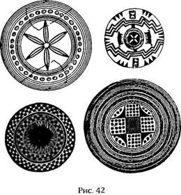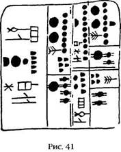 Многие месопотамские таблицы, содержащие сведения по математике и астрономии, а также календари удивили ученых своей сложностью. В основе всех этих наук лежала шестидесятеричная система счисления (с основанием шестьдесят), чье совершенство – в том числе и с точки зрения небесных явлений – уже обсуждалось выше. Эти глубокие знания существовали еще на заре шумерской цивилизации, в ту эпоху, которая называется додинастической: найденные таблички с арифметическими расчетами (рис. 41) подтверждают использование шестидесятеричной системы счисления и записи чисел. Узоры на самых старых табличках (рис. 42) не оставляют никаких сомнений в глубоком знании геометрии в те далекие времена, шесть тысяч лет назад. Возникает вопрос, являются ли все эти узоры – или, по крайней мере, часть из них – чисто декоративными, или отражают знания о Земле, ее «четырех углах» и даже о форме других астрономических объектов. Кроме того, эти узоры вносят важный вклад в обсуждение вопроса, обсуждавшегося в предыдущей главе: жители Древней Месопотамии были хорошо знакомы с кругом и прекрасно умели воспроизводить его форму.
