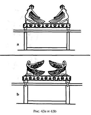 Основной заботой израильтян в тот момент были поиски дома для Ковчега Завета – не только постоянного, но и безопасного. Ковчег, изготовленный Моисеем и содержавший две каменные скрижали с десятью заповедями, полученные на горе Синай, во время Исхода хранился в скинии. Ковчег был сделан из особой породы дерева и позолочен снаружи и внутри, а также увенчан двумя золотыми херувимами «чеканной работы», крылья которых направлены друг к другу. Каждый раз, когда Моисей приходил к Ковчегу, Господь разговаривал с ним «посреди двух херувимов». (На рис. 43а изображена реконструкция Ковчега Гуго Гресманна («Die Lade Jahves»), в основу которой легли рисунки, найденные на севере Финикии; на рис. 43б показана реконструкция А. Парро из его книги «Le Temple de Jerusalem».) По нашему мнению, Ковчег с его экранирующими золотыми слоями и херувимами был коммуникационным устройством, возможно, с электропитанием (случайно прикоснувшийся к нему человек упал замертво).