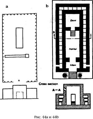 Это нашло свое отражение не только в ориентации, но и в делении храма на три части; такая планировка повторяет традиционную структуру более древних храмов в Месопотамии. Гюнтер Мартини, возглавлявший в 30-х годах исследования архитектуры и ориентации храмов Месопотамии («Die Gegensatze im Babylonischen und Assyrischen Tempelbau» и другие работы), так опи сывал традиционную планировку «культовых структур» (рис. 45а): прямоугольная передняя, удлиненный ритуальный зал и квадратная «святая святых». Вальтер Анд-реа отмечал, что в Ассирии по бокам от входа в храм располагались два пилона (рис. 45б), и это нашло свое отражение в Храме Соломона, у входа в который находились две отдельно стоящие колонны (рис. 44б).