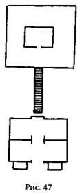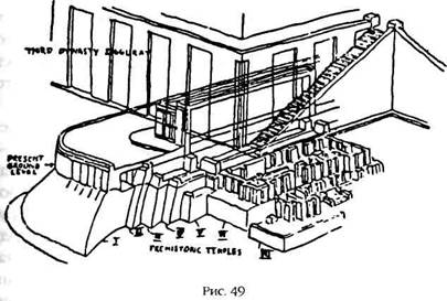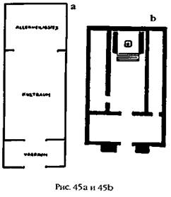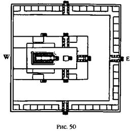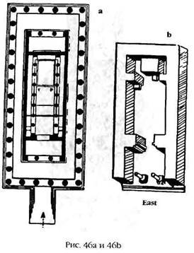 Такое деление храма на три основные части, воспроизведенное впоследствии и в других местах (например, храм Зевса в Олимпии, рис. 46а, или Ханаанский храм в Таинате в Верхней Сирии, рис. 46б), на самом деле являлось продолжением древней традиции, когда путь на вершину самых старых шумерских зиккуратов вел через два помещения – внешнее с двумя пилонами снаружи и зал для молитв. Эта структура приводится в работах Г. Мартини (рис. 47).