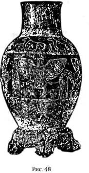 В скинии на Синайском полуострове, в иерусалимском храме и в храмах Месопотамии сосуды и принадлежности, использовавшиеся в храмовых ритуалах, были, как правило, золотыми. В текстах, описывающих храмовые ритуалы в Уруке, упоминаются золотые сосуды для возлияний, золотые подносы и золотые курильницы, и именно эти предметы были найдены в ходе раскопок. Серебро тоже использовалось, и доказательством тому может служить резная ваза (рис. 48), которую один из первых царей Шумера Энтемена преподнес в дар богу Нинурте в храме Лагаша. На изысканных царских дарах обычно наносили надпись, в которой сообщалось имя дарителя – это должно было гарантировать царю долгую жизнь.