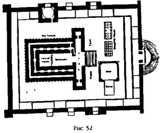 Второй Храм, построенный в трудных условиях среди разоренной земли, представлял собой бледную копию Первого Храма. Он восстанавливался по частям в соответствии с планами, сохранившимися в персидских царских архивах, а также со свидетельствами Библии – с точным соблюдением деталей, изложенных в Пятой книге Моисеевой. То, что храм повторял первоначальную планировку и ориентацию, стало ясно пять столетий спустя, когда царь Ирод решил заменить невзрачную копию новой – грандиозным сооружением, которое не только сравнится своим величием с Первым Храмом, но и превзойдет его. Он был построен на расширенной земляной насыпи (в настоящем известной под названием Храмовой горы), обнесен массивными стенами (западная стена осталась практически неповрежденной до наших дней и почитается иудеями как сохранившиеся остатки Святого Храма), а также окружен внутренними двориками и разнообразными вспомогательными постройками. Однако новый Дом Господа сохранил деление на три части и ориентацию Первого Храма (рис. 52). Более того, святая святых в точности соответствовала размерам этого помещения в Первом Храме и располагалась на том же месте – за исключением того, что она больше не называлась двир, поскольку Ковчег Завета пропал после того, как вавилоняне разрушили Первый Храм и увезли с собой все, что было внутри.