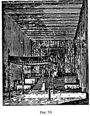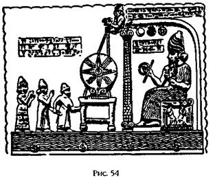 Окидывая взглядом руины обширных святилищ с их храмами, алтарями, хозяйственными постройками, внутренними двориками и расположенными в самом центре зиккуратами, невольно приходишь к мысли, что первые храмы действительно представляли собой жилище богов. Недаром они носили название «Е», что переводится как «дом». Сначала это были сооружения на искусственных холмах или приподнятых площадках (рис. 35), которые со временем превратились в знаменитые зиккураты (ступенчатые пирамиды) – небоскребы древности. В представлении художника (рис. 53) резиденция бога находилась на самой вершине. Там, сидя на троне под балдахином, боги удостаивали аудиенции избранного царя, «пастыря человеческого». Как видно из рисунка в храме бога Уту/Шамаша Эбаббар в Сиппаре (рис. 54), царя сопровождал верховный жрец, а также покровительствовавший ему бог или богиня. (Впоследствии в святая святых входил только верховный 'жрец – как изображено на рис. 55.)