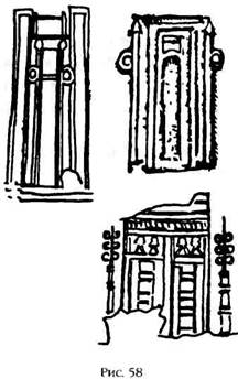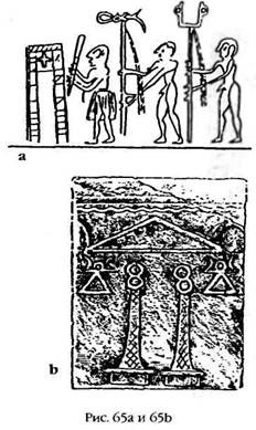 Другие рисунки с изображением шестов с кольцами, укрепленных по обе стороны входа в храм (рис. 58), дают основания предположить, что они являются предшественниками вертикальных конструкций, обрамлявших вход в храм в последующие тысячелетия, будь то колонны Храма Соломона или египетские обелиски. То, что изначально они были не просто символами, а выполняли конкретную функцию в астрономических наблюдениях, становится ясно из надписи ассирийского царя Тиглатпилезера I (1115—1077 год до нашей эры), в которой рассказывается о реставрации храма, построенного за 641 год до реконструкции и лежавшего в руинах на протяжении последних шестидесяти лет. Сначала пришлось очистить мусор, чтобы добраться до фундамента и воссоздать первоначальную планировку, а затем царь воздвиг две высокие башни, с которых можно было «различить двух великих богов». Внутри богато украшенного дворца была предусмотрена комната, в которую солнечные лучи проникали «прямо с небес», а в стенах имелись отверстия, позволявшие наблюдать за звездами.