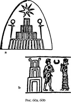 Эти тексты проливают свет на роль зиккуратов и их поднимающихся вверх ступеней в наблюдении за ночным небом, однако в связи с этим возникает интересный вопрос: наблюдали ли астрономы-жрецы за ночным небом невооруженным глазом или использовали инструменты, позволяющие точно определить момент восхода небесного тела? Ответ могут дать рисунки зиккуратов, на верхних ступенях которых располагаются шесты с круглыми предметами на конце; на их небесную функцию указывают изображения Венеры (рис. 60а) или Луны (рис. 60б).